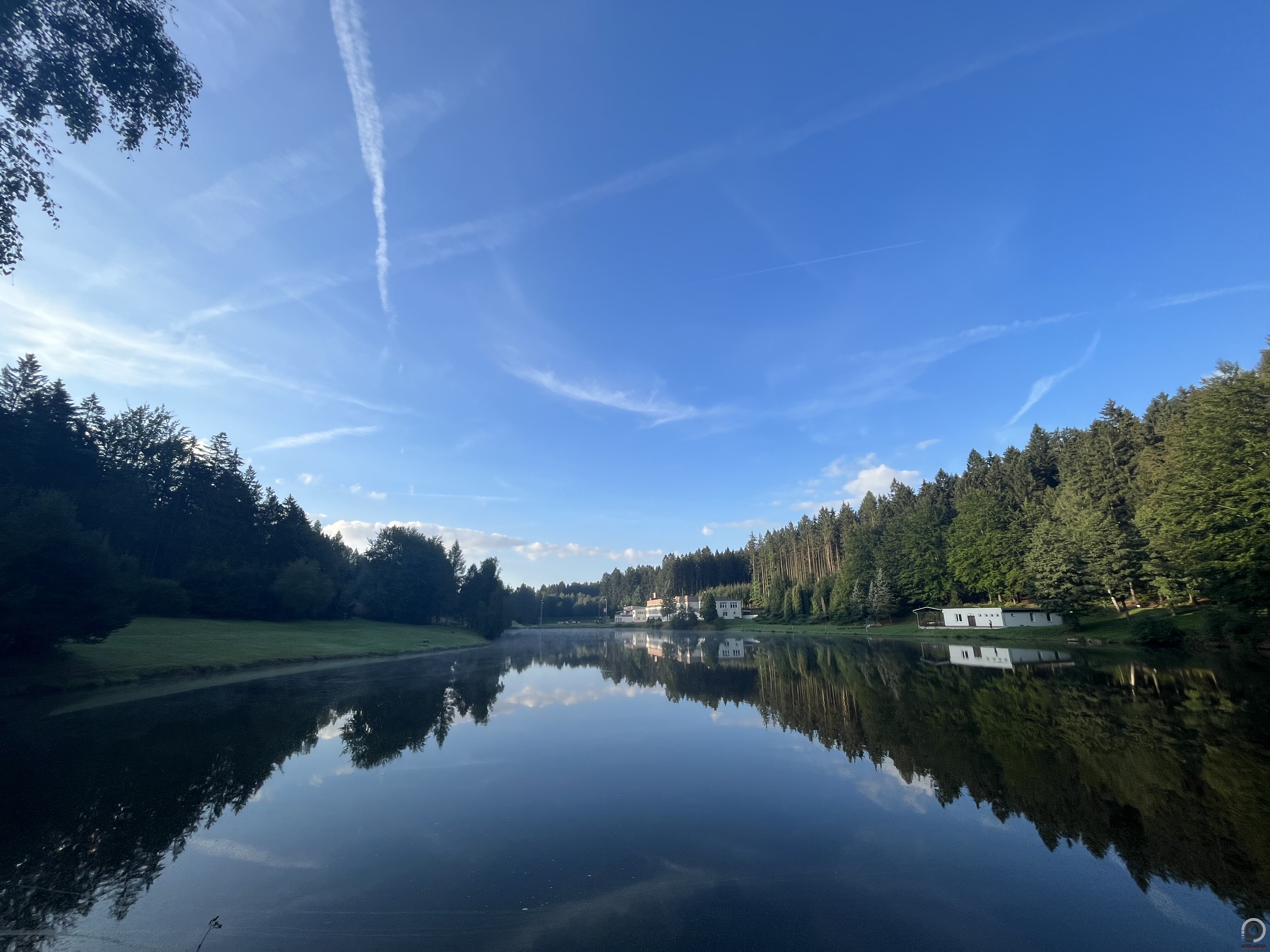 A szálló kívülről egyszerűnek tűnik, de mindennel felszerelt, szépen felújított és szó szerint tisztaságszagú, este a kulcsok mellé még inni is kaptunk, az alvással pedig nem volt gond, éjfél előtt kidőltünk. Bocha nyolc körül kelt elhúzott függönyök mögött, amivel nem járt jól, kiderült ugyanis, hogy az egymással egyébként szomszédos szobáink keleti fekvésűek és egy apró tóra néznek, a reggeli látvány pedig egész oké volt. Jó, azért valamivel több, mint egész oké, a frissen vágott fa és a nedves reggeli erdő illetának keverékével, a tavon úszkáló kacsákkal és a narancssárgás-kékes éggel inkább éreztem varázslatosnak. De beszéljen helyettem inkább néhány kép, illetve a videó.