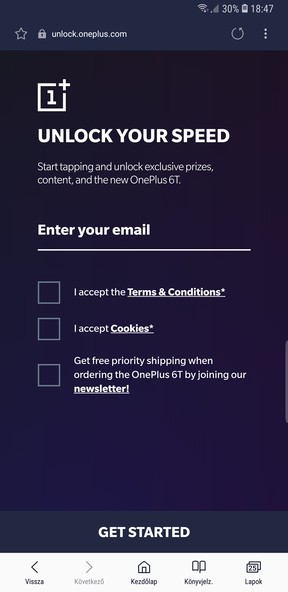 Csak egy e-mail cím és egy felhasználónév szükséges és lehet tapicskolni. A lényeg az, hogy minden 24 órában egy random érintés nyer egy OnePlus 6T-t. Ezen kívül vannak ugye egyéni célok, illetve van közös célkitűzés is. Adott mennyiségű érintés után a gyártó felfed valamit. Azt ugyan nem mondták, hogy egy új készüléket, kiegészítőt, vagy a OnePlus 6T-ről további információt, de valamit bejelentenek.