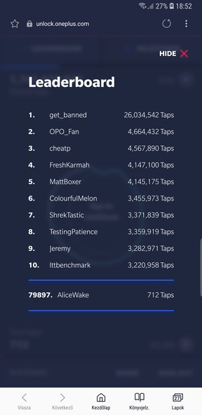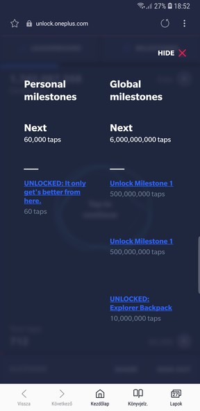 Úgy tűnik, a következő személyes mérföldkőig 60 ezerszer kéne hozzáérnem a telefonom kijelzőjéhez. Ha ez megvan, elvileg különböző kedvezményeket és OnePlus nyereményeket kapnék, de ha jól láttam, a következő cél már 6 millió lenne, amit kissé körülményesnek tűnik önerőből kivitelezni. A világszerte elérhető játékhoz a következő honlapot kell megnyitni bármilyen mobil bármilyen böngészőjében és tapodni. A honlap erre található, de csak mobilról működik: unlock.oneplus.com.