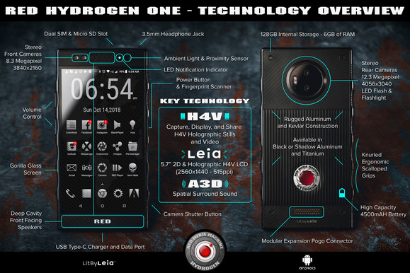 Tavaly mutatták be, de idén lesz elérhető a Red Digital Cinema holografikus kijelzővel megáldott okostelefonja, bár a titán változat megjelenése jó eséllyel jövő évre csúszik. A késedelem oka a konstrukció megalkotása mellett a Hydrogen One képességeiben is rejlik, élén az 5,7"-es, Leia 2D-s és holografikus H4V LCD panellel, 1440 x 2560 pixelen. A dupla előlapi (8,3 megapixel) és dupla hátlapi kamerák (12,3 megapixel) természetesen alkalmasak H4V kép- és videoanyag rögzítésére, hiszen erről szól a phablet, amit a gyártó elsősorban alkotóknak, filmeseknek álmodott meg.