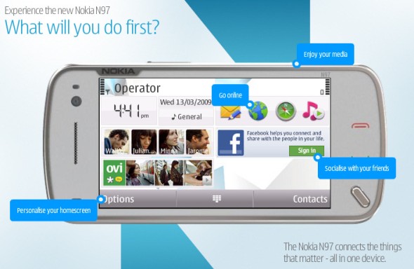 A finn óriás még tavaly jelentette be a 3,5 hüvelykes, 640x360 képpontos érintkezővel, 5 megapixeles kamerával, WLAN, GPS és sztereó Bluetooth modullal, microSDHC kártyával tovább bővíthető 32 GB belső memóriával, sztereó hangszóróval, 3,5 milliméteres fülhallgató csatlakozóval és tévékimenettel is felvértezett QWERTY csúszkás Nseries N97 csúcsmodellt, mely júniustól a boltok polcain is elérhető lesz. A gyártó számára kiemelten fontos modell a Nokia 5800-hoz hasonlóan saját oldalt is kapott, mely angol változatán olyan interaktív bemutató is elérhető, mely egyes elemei valóban működnek. Az alábbi linken elérhető bemutatóanyag például a Facebook widget segítségével be lehet lépni a saját Facebook oldalra, a web böngésző szintén üzemel, a médialejátszó a Star Trek mozielőzetesét játssza le, valamint megtekinthető a képek felöltése, játékok, zenék és más multimédiás tartalmak letöltése és az érintőkijelző testreszabhatósága is. Az alant látható képeket követő videó a teljesen átdolgozott, widget alapú készenléti kijelzőn túl a böngésző iPhone-szerű görgetőrutinjának szemléltetésére is hivatott.