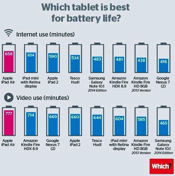 Az Apple jól tudja, hogy a felhasználó élmény nem mérhető gigahertzekben, processzormagokban vagy megapixelekben, így az Android világtól eltérően továbbra is a szoftver és a hardver tökéletes harmóniájára törekszik. Úgy tűnik, hogy a stratégia igencsak jól működik, mert habár az új táblagép-szériája nyers erő terén nem veszi fel a versenyt az Android csúcsmodellekkel, ám az iOS rendszer remek optimizálásának köszönhetően ebből a felhasználók szinte semmit sem éreznek. Ami viszont igencsak szembetűnő az az iPad Air működési ideje, hiszen az extrém magas felbontású kijelzője és kecses kialakítása ellenére a 777 perces vagyis közel 13 órányi videolejátszási, illetve 658 perces, vagyis majdnem 11 órás böngészési idejével valamennyi konkurensét maga mögé utasította.