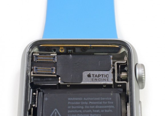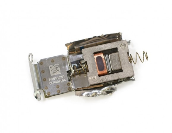 Ezt követően lehet kivenni a helyéről a készülék különlegességét és az Apple új szabadalmát, a Taptic Engine-t. Ez az alkatrész egyedülálló módon a korábbi körkörös mozgást végző vibramotorokkal ellentétben lineáris mozgást végez. Az egész készülék egyébként olyan belülről, mint egy mini iPhone. Csak minden sokkal kisebb benne.