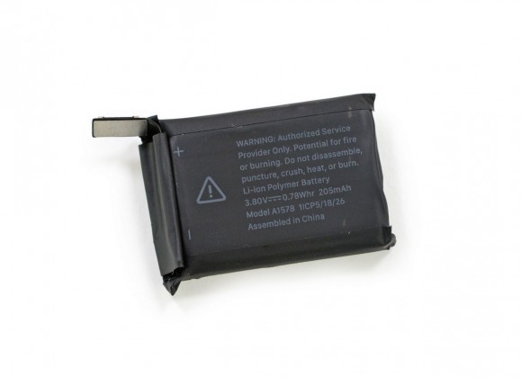 A következő művelet a ragasztott akkumulátor eltávolítása. Ahogyan azt korábban sejteni lehetett, a készülék legnagyobb részét ez az alkatrész teszi ki. Az áramforrás kivételét egy speciális nyitó/bontó szerszámmal és nagy óvatossággal kell elvégezni. Az iFixit által szétszerelt 38 mm-es Apple Watch-ban egy mindössze 3,8 V-os, 0,78 Wh-s lítium-ion akkumulátor teljesít szolgálatot.