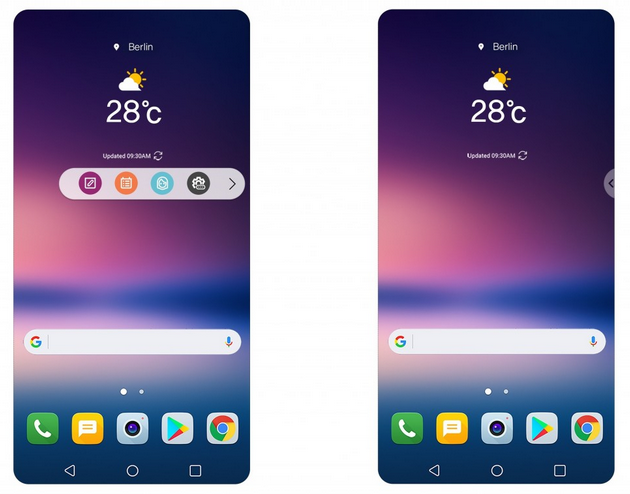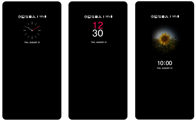 Most az új kezelőfelületbe, a UX 6.0+-ba nyertünk tekeintést, láthatjuk az alsó sávon elterülő, diszkrét virtuális billentyűket, a másodlagos kijelző helyett megjelenő lebegő sávot (Floating bar), és ha már az IPS technológiát OLED veszi át, ráfeküdtek az always-on funkciókra is, az alábbi három képernyőfotón értesítéseket és órasémákat láthatunk.
