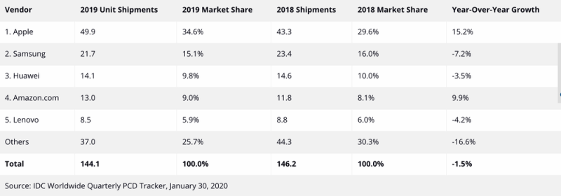 A 2019-es évet egészben nézve azt láthatjuk, hogy a piac 1,5%-ot zsugorodott világszerte, összesen 144,1 millió gép ment ki, ezek közül közel 50 millió hátulján virít Apple márkajelzés, és 21,7 viseli a dél-koreai Samsung feliratait. Éves szinten egyébként az Amazonnak sikerült nőnie 9,9%-kal: míg 2018-ban összesen 11,8 millió gépet szállítottak le, addig 2019-ben 13 millió tablet került ki tőlük.