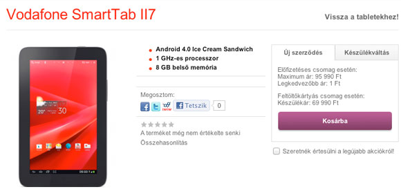 Olvasónk bukkant rá a hazai Vodafone oldalán arra a linkre, amely mögött a Smart Tab II 7 inches verziójának pontos árát és részletes specifikációját találhatjuk meg. Az osztjonapot.blog.hu némi logikától vezérelve írta be az URL-t a böngészőbe, amely lerántotta a leplet a piros szolgáltató sajátmárkás termékéről, amely csak itthon számít új modellnek, a Vodafone nemzetközi weboldalán már felbukkant nem csak a 7 inches, hanem nagyobb testvére is.
