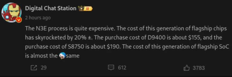 A Dimensity 9400 és a Snapdragon 8 Gen 4 is a TSMC továbbfejlesztett node-ján készülnek 3 nanométeres csíkszélességgel. Az N3E gyártástechnológia hatékonyabb és magasabb teljesítményű (egyébként nem is elhanyagolható mértékben) lapkákat eredményez, így többet is lehet érte kérni. A Snapdragon 8 Gen 3 152 dolláros és a Dimensity 9400 124 dolláros beszerzési árával szemben az idei szériák már 190 és 155 dollárba fognak kerülni a gyártóknak.