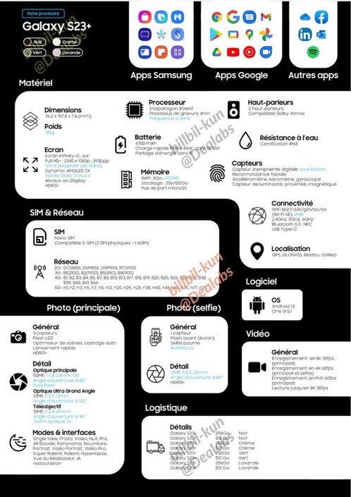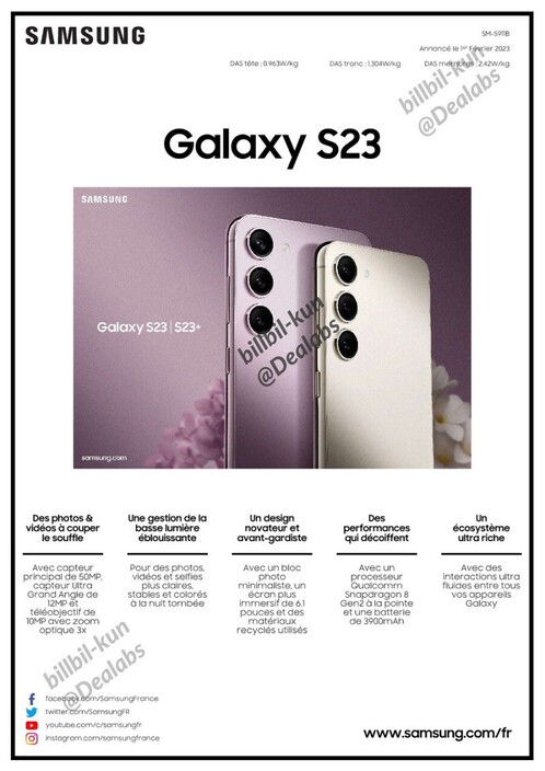 Aki nem bír ki két hetet a Galaxy S23 család startjáig, és mindenképpen, azonnal és teljes mértékben tudni akar mindent a három készülékről első kézből, annak jó hír, hogy megannyi kéminformáció után lényegében minden hivatalos anyag kiszivárgott, persze nem a Samsung engedélyével. Ömlesztve következik egy rakás kép, amelyekről minden adat leolvasható, és mivel a SamMobile, a SnoopyTech, Dohyun Kim és a WinFuture is a többnyelvű források között van, nem alaptalan a feltételezés, hogy több színfalak mögötti, sajtónak szánt eseményről jutottak ki engedély nélkül az alábbiak.