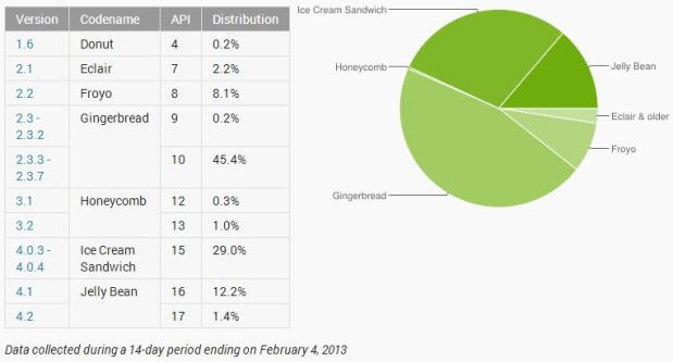 Az Android 4.1 Jelly Bean tavaly júliusi bejelentésekor sokan arra számítottak, hogy a piacon lévő modellek zöme gyorsan megkaphatja majd frissítésként, hiszen a legfontosabb változtatások a motorháztető alatt történtek. Ennek ellenére a gyors térhódítás elmaradt, de a kezdeti stagnálást követően január végére már 12 százalékosra emelkedett a platform relatív piaci részesedése. Mindeközben tavaly novemberben útjára indult az Android 4.2 Jelly Bean változat is, mely egyelőre csupán a használatban lévő készülékek 1,4 százalékán teljesít szolgálatot, vagyis a 2.3 Gingerbread változat a maga 45 százalékos részesedésével továbbra is a legerősebb bázist jelenti. A helyét persze szépen lassan átveheti majd az Android 4.0 Ice Cream Sandwich, mely jelenleg az Android világ 29 százalékát uralja.