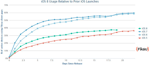 Az Apple felhasználók viszonylag gyorsan frissítenek az új szoftverekre, az iOS 6 és 7 megjelenése után egy héttel például az almás eszközök tulajdonosainak 50 százaléka telepítette fel az új operációs rendszert. Az iOS 8 viszont nem ennyire sikeres, már hetek teltek el a hivatalos kiadása óta, mégis körülbelül 40 százalékos részesedéssel bír, ami például a hibás 8.0.1 utáni elővigyázatosságnak is köszönhető.