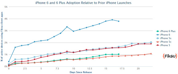 Az iPhone-oknál kettős érzése lehet az Apple-nek. Az iPhone 6 rendkívül kelendő, már öt nap alatt átlépte a 2 százalékos küszöböt, amihez a többi eszköznek több mint húsz napra volt szüksége. Az iPhone 6 Plus sem teljesít rosszul, ám messze nem ennyire kiemelkedő, körülbelül az 5c szintjét hozza, ami mondjuk a gyártási nehézségek egyik következménye is lehet.