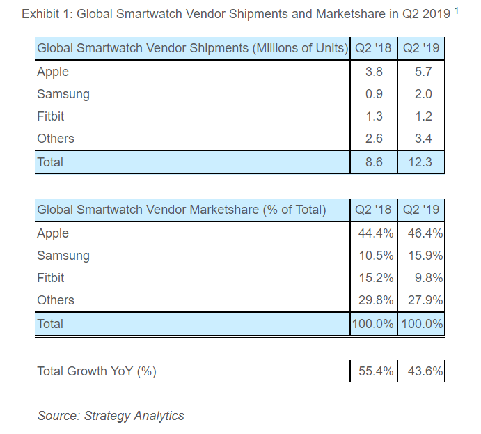A Strategy Analitics 2019 második negyedévére vonatkozó adatai továbbra is jelentős növekedést mutatnak a leszállított eszközök számában a tavalyi megegyező időszakhoz képest. A tavalyi 8,6 milliós szám 12,3 millióra nőtt, ami 44%-os előrelépés, jobbára az Apple Watch-nak köszönhetően. A második negyedévben leszállított 5,7 millió készülékkel az Apple a globális piac 46%-át uralja. A legnépszerűbb modell az Apple Watch negyedik generációja, ami az almás cég tavalyi összeladásainak majdnem felét adta, pedig a készülék csak az utolsó negyedévben vált elérhetővé.