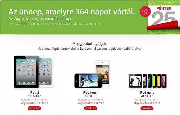 A fekete péntek a hálaadást követő első pénteki nap elnevezése az Egyesült Államokban, mely a hagyományos karácsonyi bevásárlási szezon kezdetét jelenti. Az elnevezés először az 1869-es pénzügyi válság kapcsán bukkant fel, de jelen értelmében 1966-ban került be a köztudatba. A nem túl hízelgő név Philadelphiából ered és a megnövekedett forgalomból eredő sűrű autófüstre utal, bár az újabb értelmezések szerint a kereskedők pénzügyi mérlege ekkor kezd pirosból – azaz veszteségből – feketébe – azaz nyereségesbe – átváltani. A hivatalos online áruház megnyitását követően az Apple idén hazánkban is egynapos kedvezményes vásárt rendez, de az akció pontos részletei csak pénteken kerülnek bejelentésre. Az előző évek alapján nagyjából 10-15 százalékos árengedményre lehet számítani, de csak a zenelejátszók, táblagépek, számítógépek és néhány kiegészítő esetén. Az iPhone ezidáig egyetlen évben sem került be a kedvezményes kínálatba.