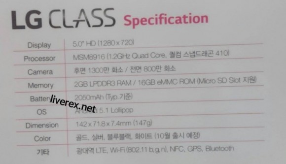 Az LG Class egy új irányvonalat indíthat el a dél-koreai gyártó életében, főleg az anyaghasználat, és a láthatóvan megváltozott formaterv miatt. Az állítólagos leírás szerint az újdonság 5 hüvelykes, 720 x 1280 pixel felbontású kijelzővel debütál majd, amit egy Qualcomm Snapdragon 410 SoC hajt meg.