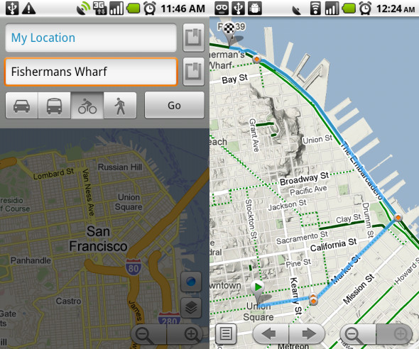 Az ingyenes online navigációval kecsegtető Google Maps Navigation sikerén felbuzdulva újabb szolgáltatással egészítette ki térképes és navigációs mobil szoftverét a Google, mely mostantól kerékpárútvonalak tervezésére is alkalmas. A térképszoftver sötétzöld folyamatos vonallal jelöli a dedikált bicikliutakat, világoszölddel az autóutak melletti kerékpárutakat és szaggatott zöld vonal jelzi a kerékpárral is biztonságosan használható útszakaszokat. A Rails-to-Trails Conservancy adatbázisából építkező megoldás egyébként az aktuális pozíció megosztását is lehetővé teszi a Facebook, Twitter és Buzz közösségi oldalakon, valamint e-mailben és rövid szöveges üzenetekben egyaránt. Az Android Marketplace online alkalmazásboltból letölthető Google Maps 4.2 Európában egyelőre sem hangos navigációt, sem pedig bicikliútvonalak tervezését nem teszi lehetővé.