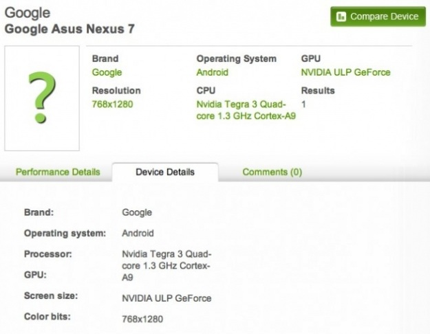 Pletykák szerint a rövidesen kezdődő Google I/O konferencia során kerülhet leleplezésére a Nexus Tab sorozat eddigi legolcsóbb tagja, mely a Motorola felvásárlása ellenére az ASUS műhelyében készülhet. A jövevény létezését a Rightware Power Board tesztszoftver online adatbázisa is megerősíteni látszik, noha pontos részletekről egyelőre nincs információ. Az Android 4.1 JRN51B, azaz várhatóan „Jelly Bean” operációs rendszer köré épülő jövevény kapcsán az 1,3 GHz-es, négymagos NVIDIA Terga 3 processzor mellett egy 1280x768 képpontos HD megjelenítő jelenléte is megerősítésre került, vagyis a 7 hüvelykes táblagép technikai fronton kellően erősnek tűnik. A június végén leleplezésre kerülő Google ASUS Nexus 7 várható ára nettó 199 és 249 dollár között alakul.