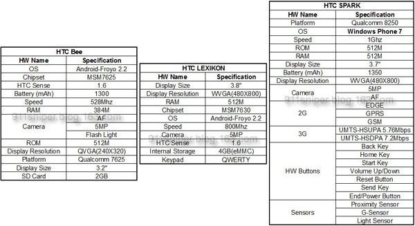 Három újabb HTC modell adatlapja került nyilvánosságra egy kiszivárgott ROM jóvoltából, melyek közül kettő a Google nyílt platformja, egy pedig a Microsoft új Windows Phone 7 operációs rendszere köré épül. A belépőszintű Wildfire utódának szánt HTC Bee az előzetes adatok szerint 3,2 hüvelykes, 240x320 képpontos érintőkijelzőt, 5 megapixeles autofókuszos kamerát, 528 Mhz-es Qualcomm MSM7625 processzort, 512 MB RAM-ot, Androd 2.2 Froyo operációs rendszert és 1.300 mAh kapacitású akkumulátort kap, melyet a szintén Google platform köré épített HTC Lexikon 3,8 hüvelykes, 480x800 képpontos érintőkijelzővel és 800 MHz-es MSM7630 processzorral tesz teljesebbé. A Windows Phone 7 platform köré épített HTC Spark az eredeti feltételezésektől eltérően nem CDMA, hanem 7,2/5,76 megabites HSPA hálózatok elérése alkalmas modell lesz, mely 3,7 hüvelykes, 480x800 képpontos érintőkijelzőt, 5 megapixeles kamerát, 1 GHz-es Qualcomm Snapdragon processzort, 512 MB ROM-ot és RAM-ot, valamint 1.350 mAh kapacitású akkumulátort kapott.