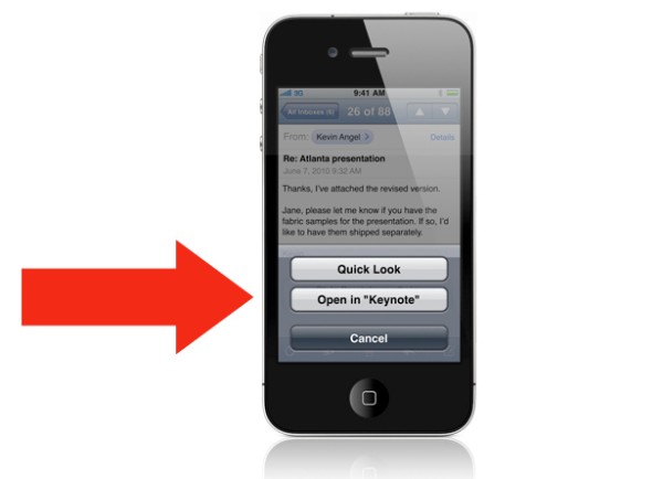 Hamarosan az iPhone 4 száma is elérhetővé válhat a dokumentumok, táblázatok és prezentációk szerkesztésére is alkalmas iWork irodai szoftvercsomag, mely a gyártó érintőkijelzős eszközei közül egyelőre csak az iPad 1024x768 képpontos felbontására került átírásra. Az Apple irodai szoftvercsomagjának iPhone 4 kompatibilis változata a WWDC során nem került hivatalosan bejelentésre, de az alant látható sajtófotó tanúsága szerint a levélhez mellékelt bemutatók nem csak az egyszerű megjelenítőben, hanem a Keynotes szerkesztőben is megnyithatóak lesznek. Ez utóbbi egyébként az iWork szoftvercsomag egyik komponense. A mindössze 3,5 hüvelykes, ugyanakkor 640x960 képpontos érintőkijelzőn a dokumentumok szerkesztése természetesen egészen más kezelőfelületet igényel mint az iPad vagy Mac esetén, így érthető, hogy az Apple miért készít minden egyes készülékéhez külön változatot.