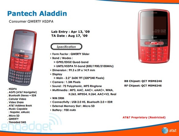 Az amerikai AT&T számára tervezett Pantech Aladdin egy meglehetősen különc kialakítású hagyományos és QWERTY gombsorral is szerelt készülék, ugyanis a számbillentyűzet alatt hosszanti irányban csúsztatható elő a teljes billentyűzete. A sok gomb természetesen rengeteg helyet emészt fel a 99,3x59x14.9 milliméteres jövevény előlapjából, így összesen 2,2 hüvelykes, 320x240 képpontos kijelzőnek jutott csak hely, melyhez 1,3 megapixeles kamera, HSDPA átviteli képesség, aGPS és sztereó Bluetooth modul, valamint microSD kártyahely is tartozik. Az alacsony árfekvésű QWERTY mobilok Európában sajnos továbbra sem túl gyakoriak, bár a helyüket kezdik átvenni a mérsékelt árú érintőkijelzős ajánlatok.