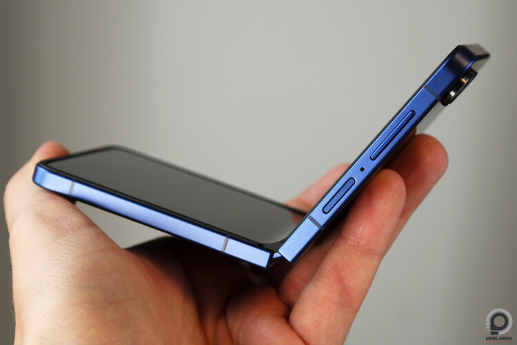 Nincs ebben semmi meglepő: ez az összecsukható képernyő átka, cserében tényleg apró a készülék, amikor zsebre vágjuk. Összehajtva a külső panelt Gorilla Glass Victus 2 üveg védi, ami csak a Mohs-skála hatos keménységű vésőjétől karcolódik meg némileg, a hetestől mélyebben a piaci sztenderdnek megfelelve. A külső lencséket sem egyszerű megkarcolni, papírvágóval például nem lehet.