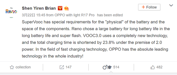 A Weibón közzétett információ alapján a VOOC 2.0 helyett a Reno vagy Renók már VOOC 3.0-s szabvánnyal dolgoznak, ami 23,8%-os tempónövekedést jelent a jelenlegi generációhoz képest. Ez még nem az Oppo Find X Lamborghini Edition féle SuperVOOC, ugyanis a technológia alkalmazhatósága függ a telep fizikai méretétől, a Reno pedig nagyobb akksit kap, mint a luxusmobil. Azért a töltés valószínűleg így is nagyon gyors lesz.
