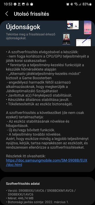 Túl van a Galaxy S22, az S22+ és az S22 Ultra a második frissítési körön a megjelenés óta, ami elismerésre méltó lendület a márka kódolóitól, viszont maradt is bőven tér a hibajavításra. Az európai S22 família a 4 nm-es Exynos 2200 chipet veti be, érezhetően visszafogottabb melegedéssel a Snapdragon 8 Gen 1-es mobilokhoz képest komolyabb játék közben. Ennek viszont több dadogás az ára, főleg komolyabb 3D játékoknál, a márka ugyanis szigorúan visszafogja a teljesítményt épp a túlzott hőtermelés elkerülésére.