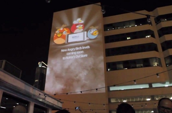 A Symbian^3 alapú Nseries N8 bemutatásakor a Nokia már egyszer elkápráztatta a világot egy Svédországban felállított 51x28 méteres, azaz 428 négyzetméteres szabadtéri vetítővászon segítségével, melyre 4 hatalmas projektor segítségével kerültek kivetítésre a készüléken tárolt HD felbontású tartalmak. Az SXSW előestéjén a Rovio és a Nokia újabb látványos reklámkampánnyal rukkolt elő, melynek központi témája ezúttal az Angry Birds 3D Symbian alapú változatának premierje volt. A 60 méter magas texasi toronyház oldalára kivetített látványos reklámfilm úgy tűnik, hogy számos rajongót ragadott magával, a show részeként megtekinthették ahogy a madarak néhány ablaktörés kíséretében visszaszerzik a malacoktól a Nokia N8-at.