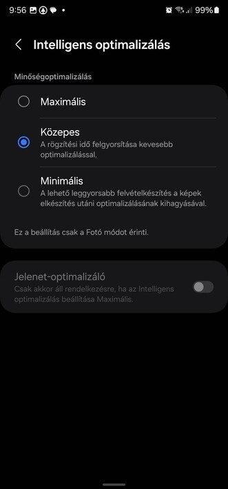 Egyfelől az Expert RAW kameraszoftver használata, másfelől a Kamerabeállítások között az Intelligens optimalizálást maximális minőségről Közepesre állítva. Azért ez az apró baki túl nagy kellemetlenséget nem okoz, de valahogy beszivárgott a kódba.