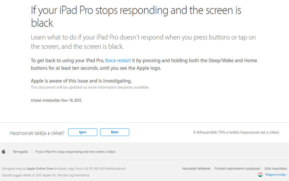 Megjelent az iPad Pro, az Apple eddigi legnagyobb, legdrágább táblagépe, és az előzetes eredmények szerint ez az iTermék is népszerű lesz, ám nem hibátlan a 12,9 hüvelykes kijelzővel megáldott monstrum startja, egy elég komoly hibára máris sokan felhívták a gyártó figyelmét. Miután ugyanis rádugták a készülékre a töltőkábelt, többen is azzal szembesültek, hogy táblagépük lefagyott, és sem a home gomb, sem a bekapcsoló hosszú megnyomása nem segített felébreszteni vagy újraindítani. A megoldás egy fokkal bonyolultabb, amit az Apple hivatalos formában jelez is, ezzel közvetetten elismerve a hiba létét.