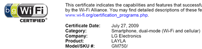 Az LG várhatóan nemsokára hivatalosan is leleplezi majd Layla nevű készülékét, mely nagy valószínűség szerint az amerikai piacon kezdi majd meg pályafutását. A WLAN tanúsítvány megszerzése során leleplezett Windows Mobile 6.5 alapú készülék 240x400 képpontos érintőkijelzőt, 5 megapixeles kamerát, GPS, WLAN és sztereó Bluetooth modult, S-Class kezelőfelületet és egy új „Chat on Map” alkalmazást is kapott, mely utóbbi arra lenne hivatott, hogy csevegés közben a térképen is megmutassa hol is tartózkodik pontosan a beszélgetőpartnerünk.