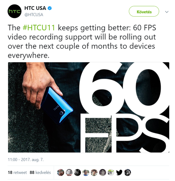 Eddig arról tudtunk, legalábbis is az FCC információi alapján, hogy a HTC feltett szándéka a 4.2-es verziószámú Bluetootht 5.0-ra fejleszteni. Ez ugye szoftveresen megoldható, a Snapdragon 835-ös lapkakészlet tökéletesen alkalmas a műveletre, most viszont maga a HTC közölte a frissítés tényét, amely az alapvetően sem gyenge kameraképességeket tolja meg. A HTC U11 felhasználók tehát az elkövetkező hónapokban világszerte számíthatnak egy frissítésre, amely biztosan tartalmazza a 60 fps videofelvétel lehetőségét, bár valószínűleg csak FHD minőségben, valamint feltehetően a Bluetooth upgradet is.