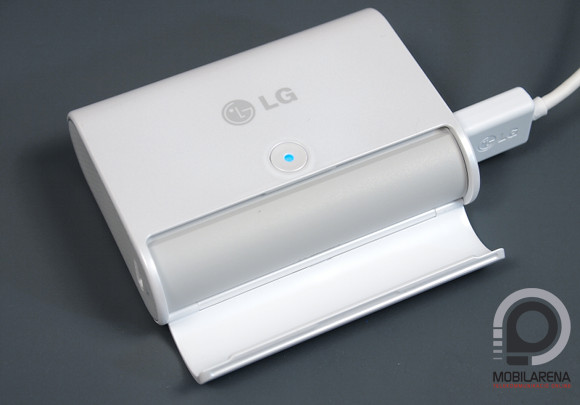 A második tartozék egy hordozható akkumulátor, mely igen okos kialakítással rendelkezik. Az előlapi panel ugyanis lehajtható, melybe bármilyen készüléket bele lehet helyezni, mint az az alábbi képek egyikén is látszik. A PMC-510 típusszámú eszköz két foglalattal rendelkezik: az áramfelvétel a microUSB-aljzaton keresztül zajlik, az USB-kimenet pedig a készülékek töltésére szolgál. Ennek megfelelően a PMC-510 egy univerzális eszköz, azaz bármilyen készülék tölthető vele, amennyiben rendelkezünk egy USB-bemenetre csatlakoztatható kábellel.