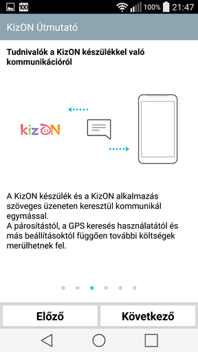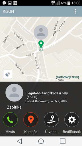 A másik fontos funkció a gyermek helyzetének meghatározása a beépített GPS és a WiFi routerek jeleinek segítségével – ezt is a szülő kérheti a telefonos alkalmazással. Nyilván kevésbé működőképes a dolog, ha a gyermek zárt térben van, mindenesetre, a pozíciószerzés után (ami 1-2 percig is eltarthat) érkezik az SMS, az alkalmazás pedig kiolvassa és megmutatja a térképen a KizON helyzetét hozzávetőleges pontossággal és címmel. Az alkalmazásban visszakövethető a csemete legutóbbi néhány pozíciója, élő követés viszont nincs, hiszen akkor folyamatosan küldözgetni kellene SMS-eket, a KizON nem is erre lett kitalálva. A lényeg, hogy a szülő vagy a gondviselő tisztában legyen azzal, hogy a gyermeke jókor, jó helyen van-e, elindult-e a suliból, esetleg a rokonnál, azaz a kívánt zónában tartózkodik. Ebben segít az opció, amelyet beállítva a KizON a nap előre meghatározott időpontjaiban automatikusan elküldi a koordinátákat, így a szülőnek csak annyi a dolga, hogy rákukkant mobiljára, hogy minden rendben van-e.