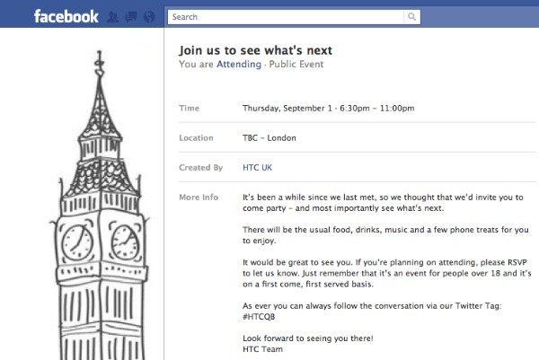 A Samsung mellett a HTC is szeptember első napján szeretné bemutatni legújabb készülékeit, melynek helyszíne a berlini IFA szakkiállítás helyett egy saját londoni rendezvény lesz. A gyártó hivatalos Facebook oldalán elérhető meghívó ugyan nem tesz konkrét utalásokat új modellek bejelentésére, de a Pocket-Lint állítása szerint a tavalyi rendezvényhez hasonlóan idén is több új készülék és szolgáltatás leleplezésére lehet számítani. Pletykák szerint a tajvani gyártó tíz nap múlva indítja útjára a Ruby és Bliss néven megismert okostelefonjait, valamint a szintén Android alapokon nyugvó Puccini táblagépet is.