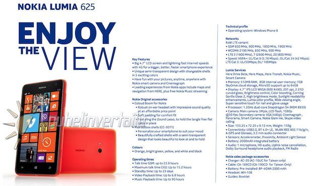 A Nokia várhatóan órákon belül hivatalosan is leleplezi Windows Phone 8 palettájának legújabb tagját, mely nem annyira műszaki paramétereivel, mintsem méretes megjelenítőjével kíván hódítani. A sorszám alapján is kikövetkeztethető, hogy a készülék a mérsékelt árfekvésű Lumia 620 közeli rokona lesz, vagyis árban és felszereltségben is hasonló ajánlatra lehet számítani. A finn Puhelinvertailu által megszellőztetett adatlap szerint a Lumia 625 legnagyobb aduásza a Gorilla Glass 2 üveggel védett 4,7 hüvelykes, kesztyűben is használható IPS kijelzője lesz, mely azonban csupán 480 x 800 képpontos felbontással rendelkezik. Az új Nokia modell a 4G LTE hálózati támogatástól és a Full HD videofelvételi opciótól eltekintve teljesen átlagosnak mondható, hiszen 5 megapixeles fő és VGA előlapi kamerát, GPS, WLAN és Bluetooth 4.0 LE modult, 1,2 GHz-es kétmagos Qualcomm Snapdragon S4 processzort, 512 MB RAM-ot, microSDHC kártyával bővíthető 8 GB belső tárhelyet és 2000 mAh kapacitású akkumulátort kapott. A 133,25 x 72,25 x 9,15 milliméteres és 159 grammos Lumia 625 várható ára egyelőre nem ismert.
