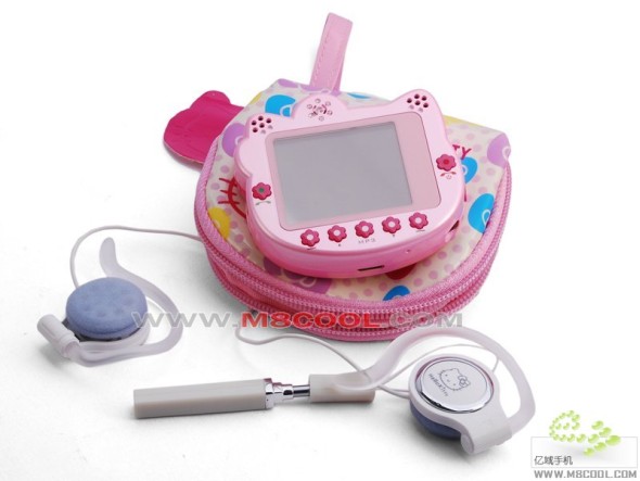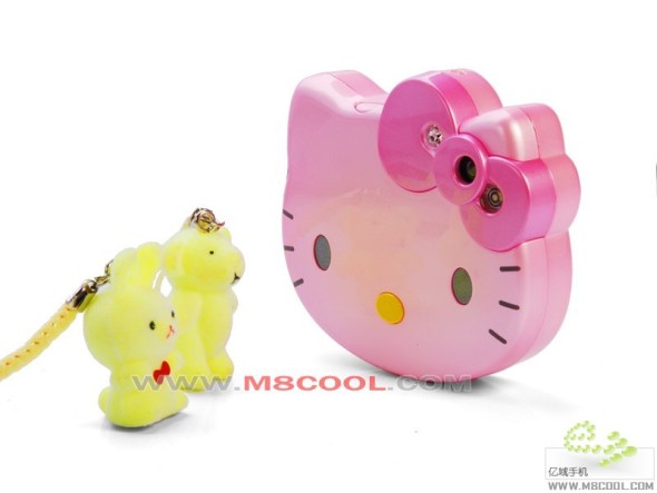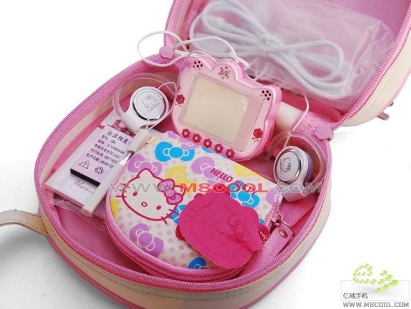 Az alant látható Hello Kitty készülék még a legsötétebb rémálmokon is képes túltenni, már ami a kezelhetőséget illeti. A nem éppen emberi kézhez tervezett, macskafejt formáló szerkezet érintésérzékeny menüt kapott, de ami ennél is sokkolóbb az a kiegészítők tárháza, mely színben és stílusban ugyanakkor tökéletesen illeszkedik a mobilhoz. A macskafejes headset, rózsaszín akkumulátor, és színes hordtáska mellett az egyetlen alkatrész ami kilóg a sorból az az USB kábel, mely igen konszolidált fehér színű. A furcsa készülék gyártóját azonban meg is lehet dicsérni ötletességéért, ugyanis a telefon gyári doboza egy táska is egyben, tehát annik is megvan a használati értéke, még akkor is ha ugyanolyan rózsaszín, mint maga a telefon.