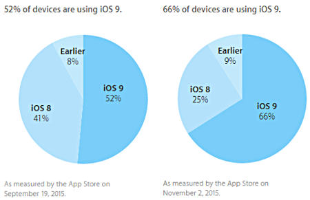 Ahogy az lenni szokott, az Apple ebben a hónapban is közzétette, hogy a kompatibilis készülékek hány százalékán fut a legfrissebb szoftververzió. Az eredményeket az App Store adatai alapján számolják, vagyis hogy milyen rendszert futtató eszközzel látogatnak el az alkalmazásboltba a felhasználók. A november 2-ai riport szerint már 66 százalékos részesedéssel bír az iOS 9, ami másfél hónap alatt meglehetősen jó mutatónak számít.