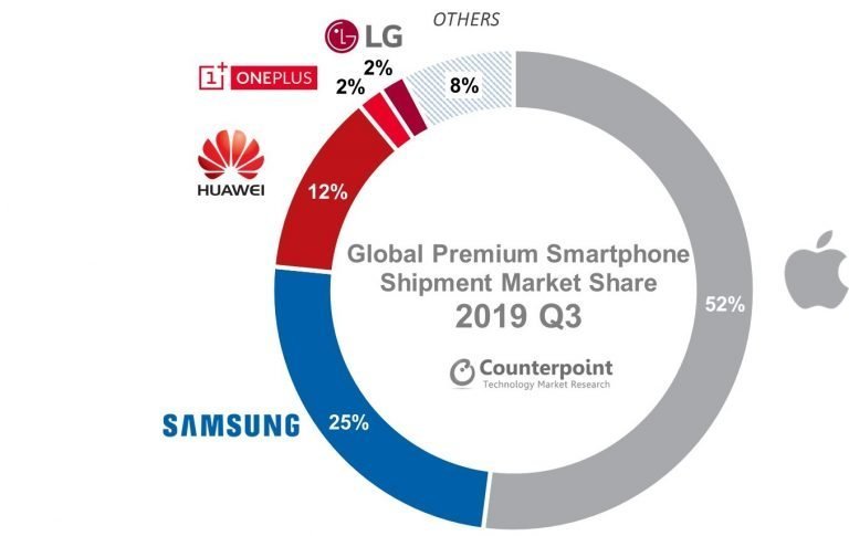 A Counterpoint prémium szegmensre vonatkozó elemzése ismét az Apple kimagasló, 52%-os dominanciájával zárult. Az elemzők a 600-800 dollár (179-239 ezer forint) közötti árszinttel kezdik a prémium kategória definiálását, amit a 800-999 (239-299 ezer forint) dolláros sáv követ, majd értelemszerűen az 1000 dollár (300 ezer forint) fölötti készülékek jönnek. Az első kategóriában az iPhone XR még mindig piacvezető, de az iPhone 11 népszerűsége is szignifikáns.