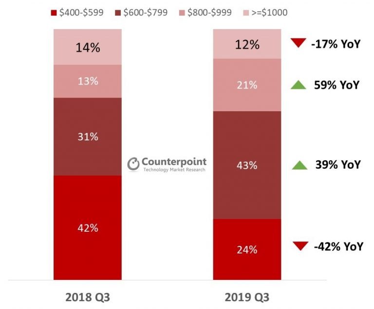 A legtöbb készüléket összesen a 600-800 dolláros árkategóriában adják el világszerte (Apple), míg az 1000 dollár fölötti modellek forgalma valamelyest visszaesett. A leggyorsabban növekvő árszegmens a 800 és 999 dollár közötti, ahol a Samsung 145%-kal erősödött a tavalyi megegyező időszakhoz képest, főleg az S10 és Note10 szériának köszönhetően.