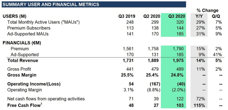 320 millióra nőtt aktív felhasználóik száma, ebből 144 millió prémium előfizetőjük van, és 185 millió felhasználó a reklámok hallgatásával támogatja a céget. A tavalyi év hasonló szakaszához viszonyítva az össz-számok 29%-ot növekedtek, de az idei második, tehát előző mért negyedévhez képest is 7%-ot fejlődtek. Továbbra is a Spotify a legnagyobb zenei szolgáltató, az Apple Music utolsó, nyári közleményében még 60 millió felhasználónál jártak, amit a Spotify már csak a fizetős ügyfelek tekintetében is duplázott akkor. Százalékosan nézve, európai szinten 34% áll a Spotify mellett a felhasználók közül, és az amerikai piacokon is 22-25%-ot tud magáénak, míg világszinten 19%-os a részesedése. A több mint 92 piacon jelen lévő szolgáltató mostanra 60 millió körüli zeneszámot oszt meg a platformon.