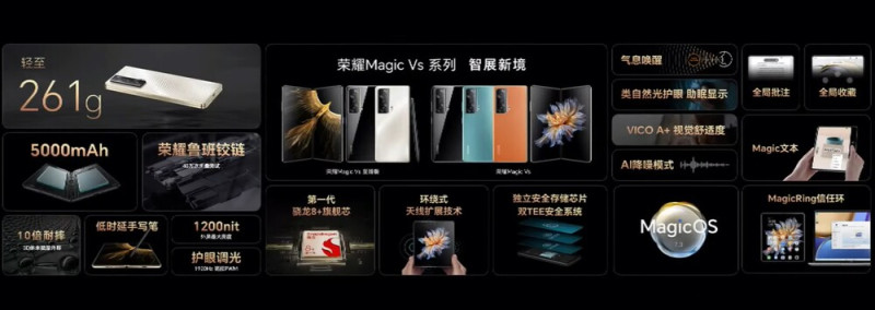 A Honor Magic Vs valamivel kisebb és könnyebb (261 gramm) lett, mint az Magic V, ezzel együtt belefértek a megszokott méretű kijelzők, az akkumulátorkapacitás viszont 5000 mAh-ra nőtt. Ehhez 66 wattos gyorstöltés tartozik, ami 46 perces töltési időt jelent. Visszatérve a megjelenítőkre, papíron úgy tűnik, nincsen változás, a belső, 10-bites flexibilis OLED panel 7,9 hüvelyken terül el 2272 x 1984 pixeles felbontással és 90 Hz-es képfrissítéssel, a külső megjelenítő pedig maradt 6,45 hüvelyk, 120 Hz-en FHD+ felbontás és HDR10+ támogatás mellett, a képarányok viszont picit módosultak, így belül 10,3:9-et látunk, kívül pedig 21,3:9-et, ami még mindig jóval közelebb áll egy hagyományos készülék arányaihoz, így a bevitel és kezelés valószínűleg továbbra is kényelmesebb, mint a Galaxy Z Fold modellek esetében.