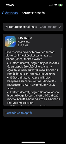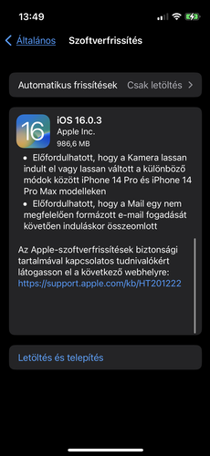 Október 10-én estétől letölthető az iOS 16.0.3 az összes iPhone 8-nál újabb Apple telefonra. A frissítés nagyjából 1 GB-ot nyom, biztonsági frissítések és egyéb javítások vannak benne. Ilyen például, hogy minden iPhone-ban javítja a problémát, melynek nyomán a Mail alkalmazás nem megfelelően formázott e-mail fogadását követően összeomlott.