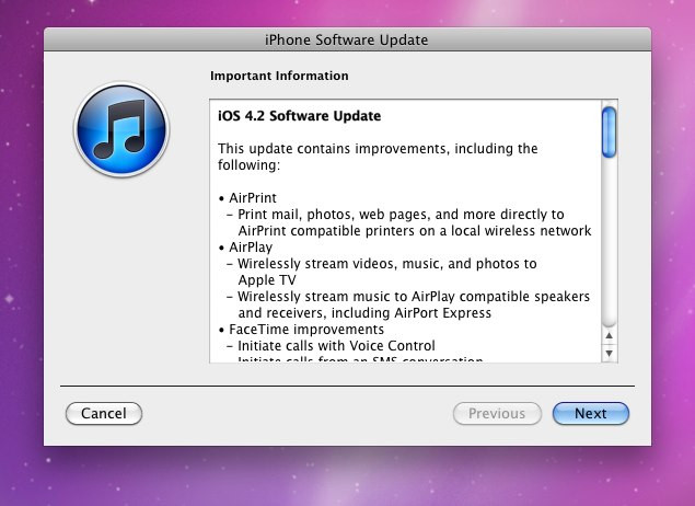 A WLAN hálózatok kezelésével kapcsolatos kisebb hibák után végül világszerte is elérhetővé vált az iOS 4.2 rendszerfrissítés, mely iPad, iPhone (3G, 3G S, 4) és iPod Touch (2G, 3G, 4G) modellekre egyaránt letölthető. Az iPad kapcsán a multitasking mellett komoly előrelépés lehet a Game Center, az AirPlay és az AirPrint integrációja, valamint a készenléti kijelzőn a könyvtárak egyszerű létrehozásának lehetősége, míg az iPhone 3G tulajdonosok számára a jóval nagyobb sebességű működés adhat okot a frissítésre. A 624 MB méretű firmware letöltése kizárólag iTunes 10.1 segítségével lehetséges.