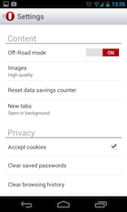 Az Off-Road mode az Opera Miniből ismerős lehet, az opciót aktiválva a kliens a weboldalak tömörített verzióját tölti le. Ez jó hatással van az adatforgalomra és a sebességre, viszont a képek esetén minőségbeli romlást idézhet elő. Apropó képek: a beállítások között megadhatjuk, hogy milyen minőségben szeretnénk viszontlátni a lapok tartalmát.