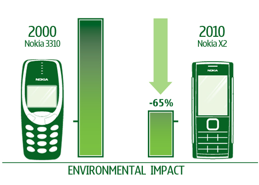 Az elmúlt évtized alatt a környezetbarát gyártástechnológiák rengeteget fejlődtek: a Nokia X2 a színes kijelzője ellenére például harmad annyira terheli csupán a környezetet, mint a 2000-ben bemutatott Nokia 3310; mely kalkuláció a termékek teljes életciklusát magában foglalja az alapanyagok előállításától a fejlesztésen, legyártáson és használaton át egészen a 100 százalékos újrahasznosításig. A finn gyártó készülékei nem tartalmaznak brómozott és klórozott vegyületeket, antimon-trioxidot, PVC-t, higanyt, ólmot, valamint a töltők készenléti energiafelvétele is 80–95 százalékkal csökkent az elmúlt évtized során, mely a csatlakozóba bedugva felejtett töltők esetén 0,03 wattos fogyasztást jelent. A Nokia szerint a nevelő célzatú környezetvédelmi játékok és alkalmazások mellett rendkívül fontos a rendszeres szoftvertámogatás is, mely révén egy-egy készülék életciklusa jelentősen megnyújtható.