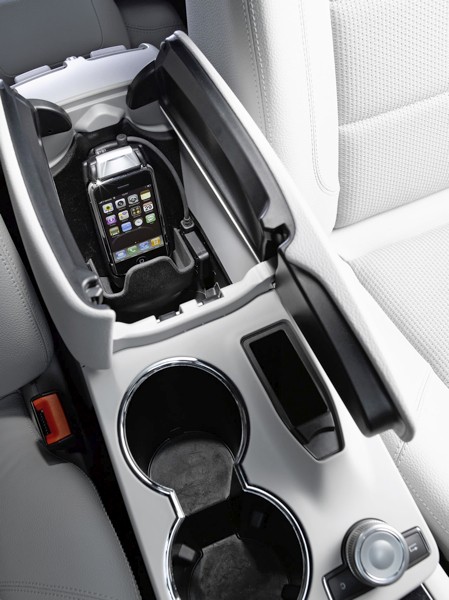 The iPhone integration recently announced by Mercedes-Benz is made to replace previous, not as good iPod solutions. The new iPhone cradle, besides avoiding a number of uncomfortable things, provides some new features. Thanks to the new solution the controller of the iPod and the iPhone can now use the car's main and secondary display, the one that is behind the steering wheel and it can be controlled both from the steering wheel and the COMAND controller. The cradle also charges the phone, and it also uses the car's antenna as an external antenna and can increase signal strength. Besides the track list the phonebook can also be displayed on the car's main screen; this feature wasn't available on previous Bluetooth-based Mercedes-Benz solutions. Those who already have an iPod kit or a Media Interface pack can buy the new pack for only €39 EUR, while the full package will cost €249 EUR in Germany.