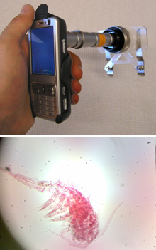Go tech students! This handy idea, brought to you by the minds at University of California, Berkeley, brings up to a 60x microscope to your cell for roughly $75. The 60x attachment is useful for diagnosing things like Malaria while in the field, while its weaker 5x sibling can be used to look at skin conditions. The prototype was apparently made from off the shelf components -- including some low power LEDs that illuminate the subject -- and snaps in place with a modified belt clip. This is a pretty handy piece of kit when you consider how much easier it may be to snap a pic of something and fire it off to a lab via a data connection instead of having to physically bring a sample. We're sure the poor soul featured in the pic we have here agrees, as it looks like he / she may have a tiny shrimp infestation.