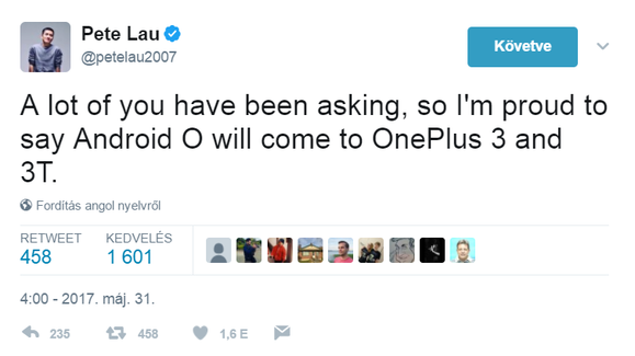 Mindeközben Pete Lau, a OnePlus alapítója és vezérigazgatója Twitter bejegyzésben erősítette meg, hogy a OnePlus 3 és OnePlus 3T is megkapja majd az Android legújabb főverzióját. A két készülék jelenleg 7.1.1-es rendszerrel fut, feltehetően a OnePlus 5 is ezzel startol, de természetesen az Android O fogja követni.
