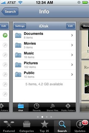 A Nokia Ovi Files szolgáltatásához hasonlóan az Apple MobileMe online tárhelye is segítséget nyújt a saját számítógépen tárolt adatok távoli elérésében, méghozzá akkor is, ha az épp nincs bekapcsolva. A frissen bemutatott MobileMe iDisk alkalmazás segítségével az iPhone és iPod Touch felhasználók is hozzáférhetnek a MobileMe online tárhelyhez, egészen pontosan csak a 20 MB-nál kisebb méretű és a készülék által támogatott formátumú állományokhoz. A szoftver segítségével lehetőség nyílik a fájlok megosztására is, méghozzá linkek elküldésével, melyekhez a hozzáférést időkorláttal és jelszóval is védeni lehet.